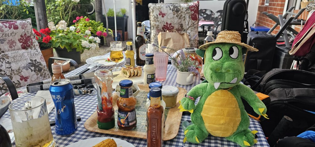 Und dann war ich wieder in Oebisfelde! Von hier aus startete ich ja damals mein Abenteuer Korea, als mich Gronis Mami nach Korea schickte. Und jetzt durfte ich mit am Tisch sitzen. Es gab Grillwurst und -fleisch, das hab ich mir schön scharf gemacht. Wenn Herr Groni glaubt, er könne „scharf“ essen – hahahaaa, ich kann Feuer spucken!