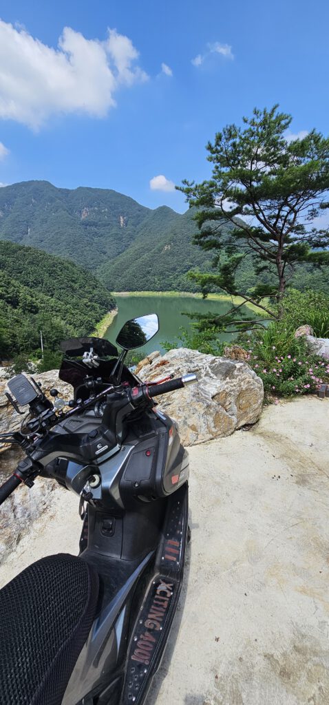 Die Reise durch das Land am nächsten Tag war echt schön – nicht zu heiß, der Fahrtwind kühlte ganz gut, und viele schöne Landschaften, bis wir in Suanbo waren. Das ist ein Ort, an den Groman ganz oft kommt, weil man von hieraus wunderbar in alle Richtungen weiterreisen kann (wenn man aus Seoul kommt). Dort gibt es ein Restaurant, wo Mr.Gro schon bekannt ist, weil er immer hier essen kommt, wenn er in Suanbo ist.