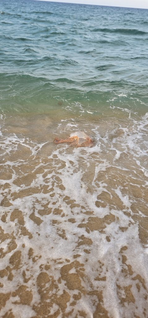 Aber das war sooo wild! Man konnte nicht so schön im Wasser sitzen wie in Mallipo 🙁 Und dann hat eine Feuerqualle Herrn Groni erwischt und ihn am Bein verbrannt! Zweimal, weil Teile von dieser eigentlich schon toten Qualle überall rumschwammen. Irgendwann wurde die Qualle auch selbst sichtbar – ein ekliger Brocken Schleim mit schmerzenden Nervententakeln!