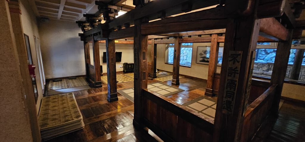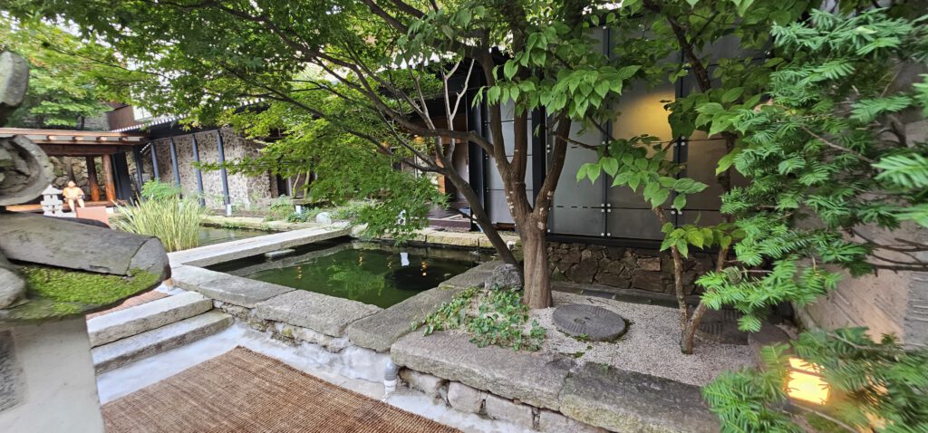 Die Sauna, in der wir danach waren, ist die schönste die the Groneman je gesehen hatte! Alles im ultra traditionellen koreanischen Stil, sogar ein Teich mit Zierkarpfen war dabei, windschiefe Kiefern, runde Torbögen, koreanische Fenster, Türen und Räume – wunderschön! Eine Bulgama-Sauna (manche nennen die den „Pizzaofen“, weil die ungefähr so aussieht). ansonsten schöne Ruheräume, wundervoll!